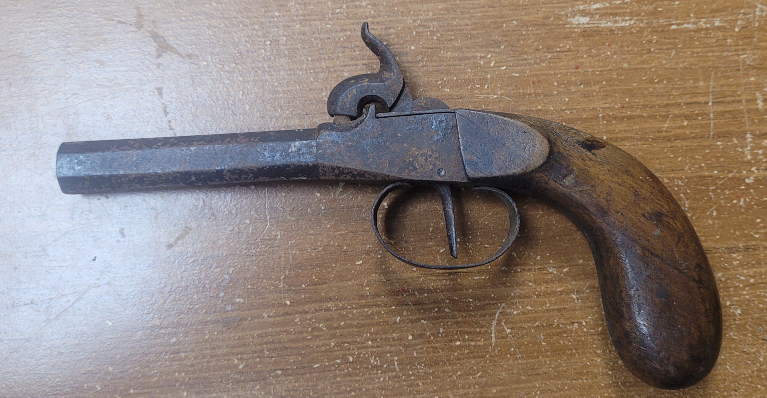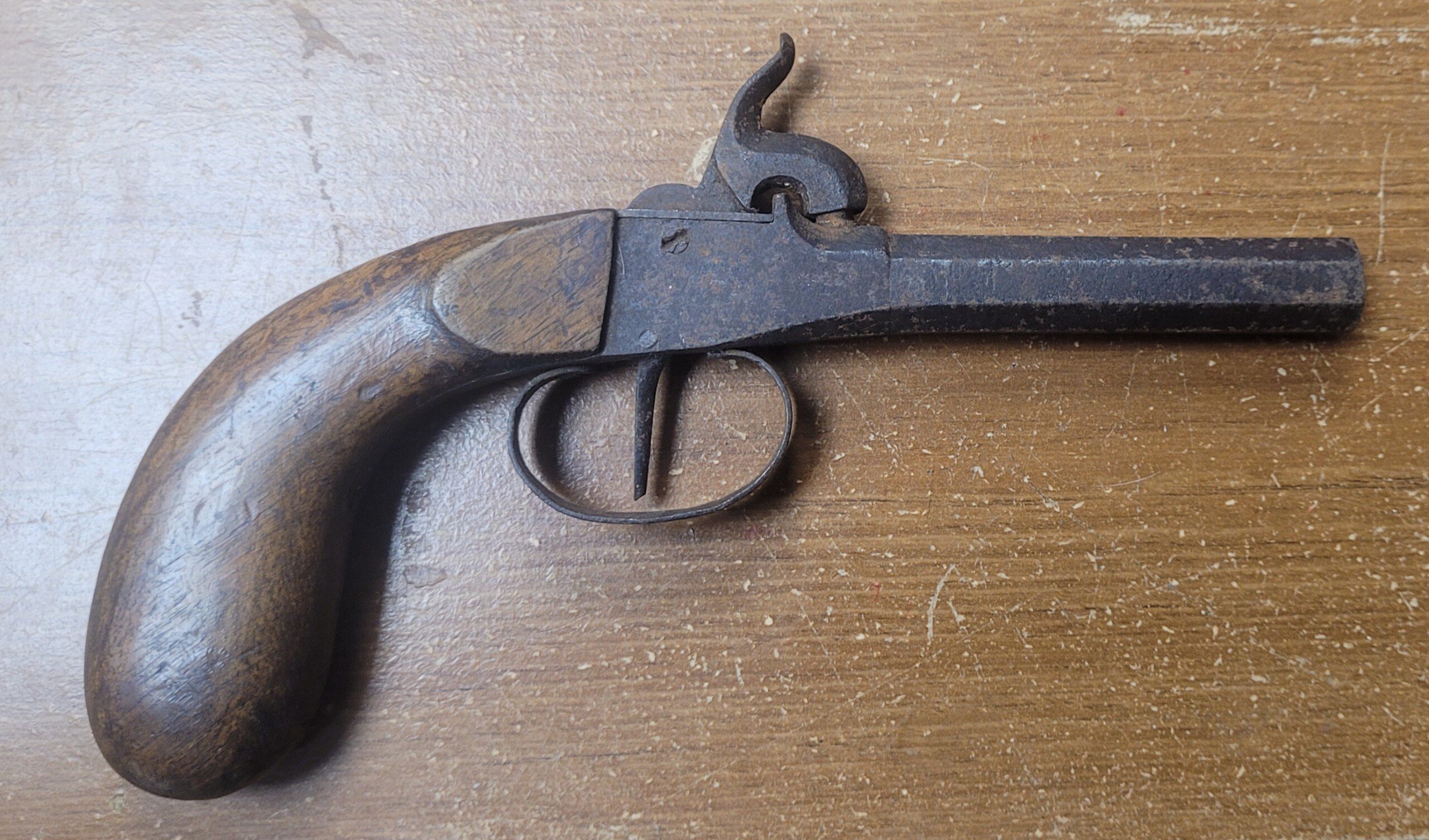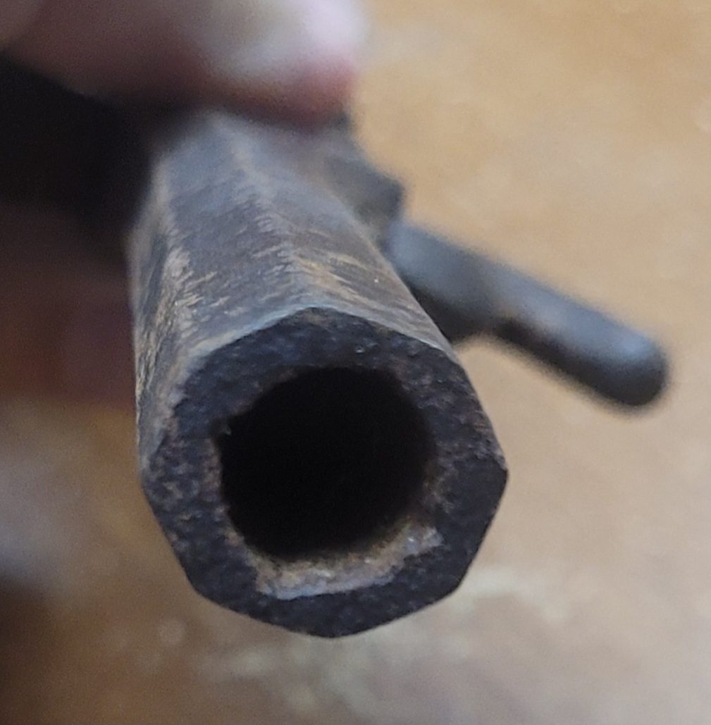 This is a well balanced and executed single shot pistol that measures about 8″ overall. While technically called a boot pistol, it is long enough to be called a belt pistol as well. The action is tight and crisp and the metal exhibits a smooth age patina overall–it has not been cleaned or altered in any manner since found. The grip is bag shaped and is in excellent condition. With patience and effort, it will easily clean to VG if so desired. This handgun was found in an old North Carolina collection and has not been ANYWHERE since the 1950s! Fresh as they come and an inexpensive secondary back up weapon for a soldier from the North or South.
