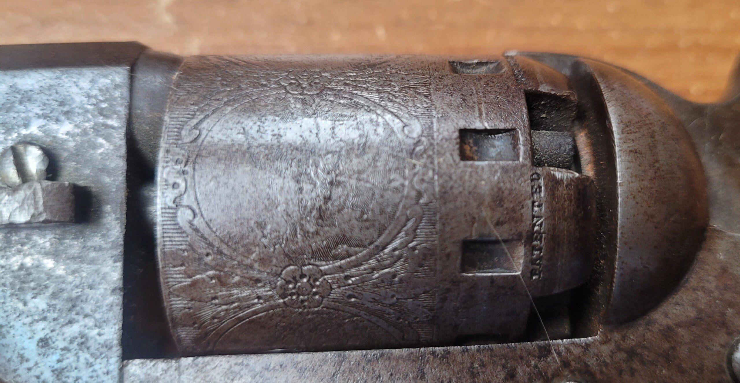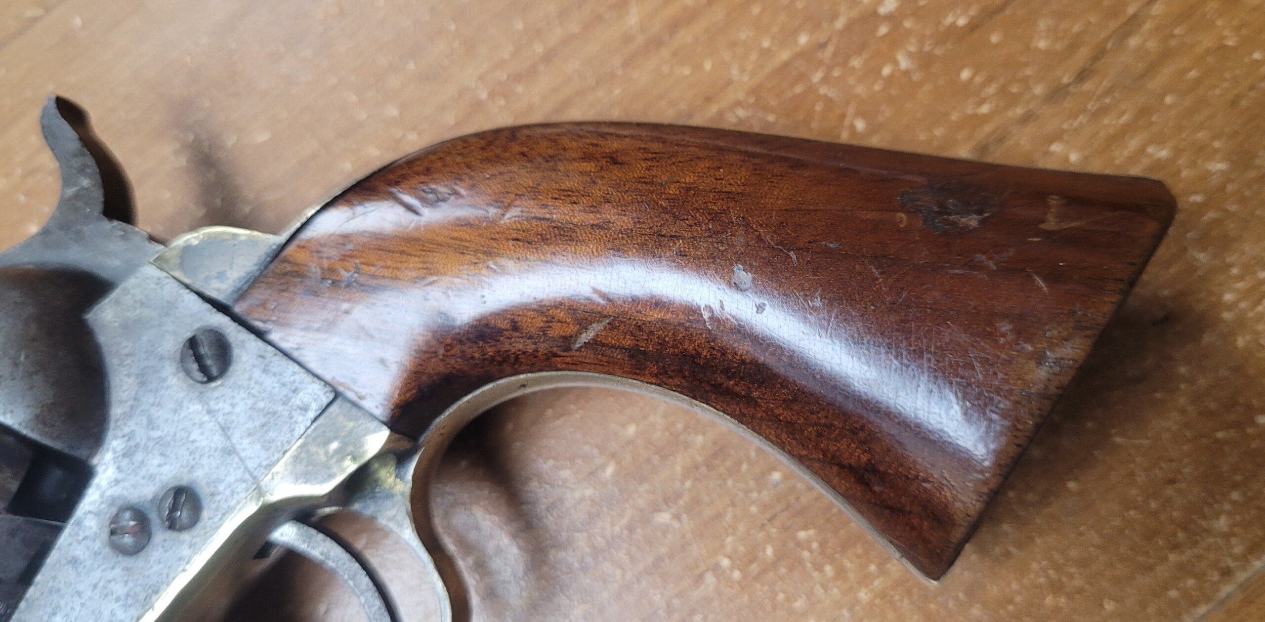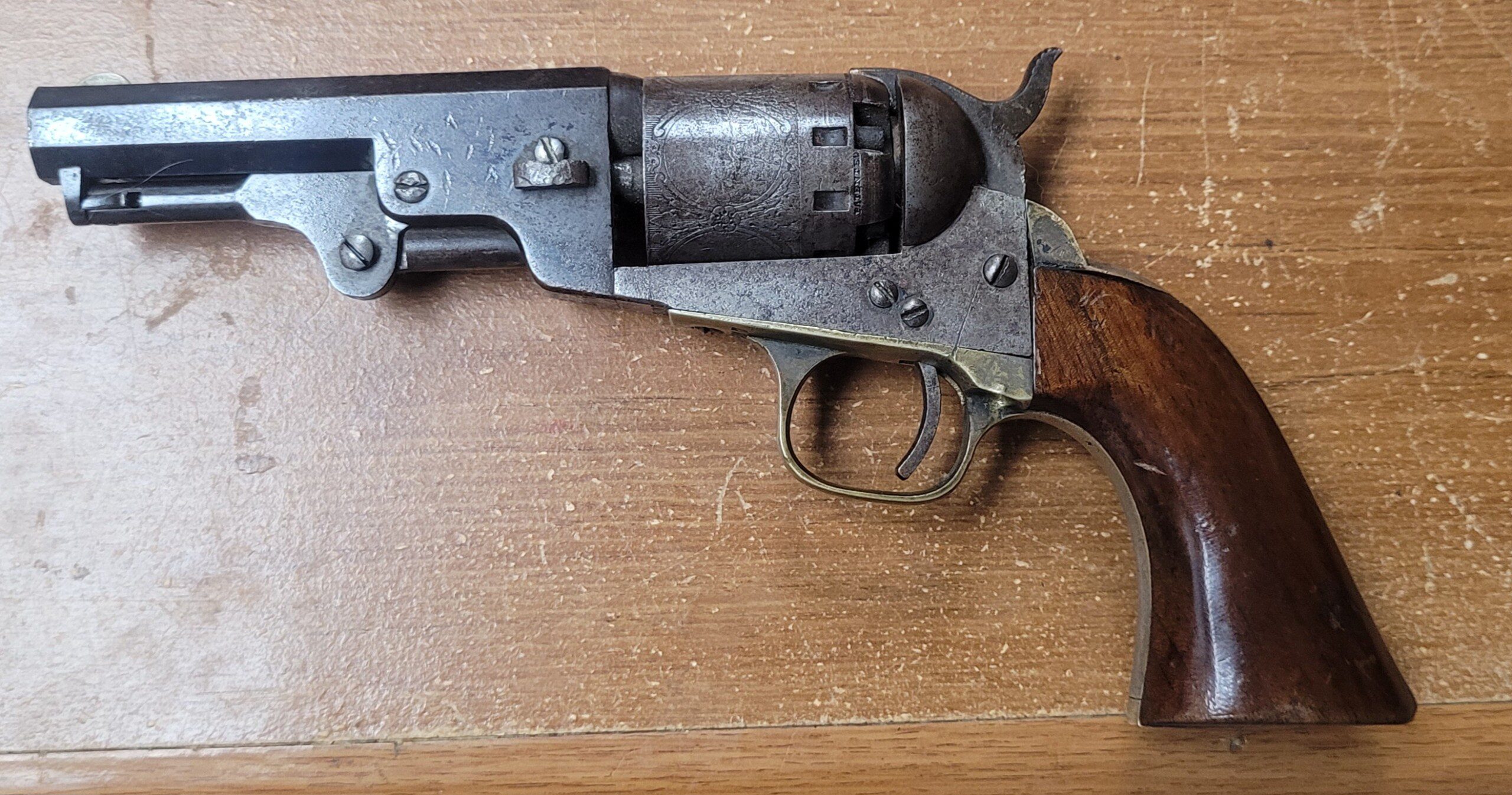 The varnished grips retain 95%+ original finish and the backstrap and triggerguard retain 50% +/- original light silverplate wash. This compact .36 caliber revolver carried the same powder charge as a full frame Navy type revolver making it incredibly powerful as well as accurate. The cylinder holds five (5) rounds and all parts are original to the weapon and are matching.