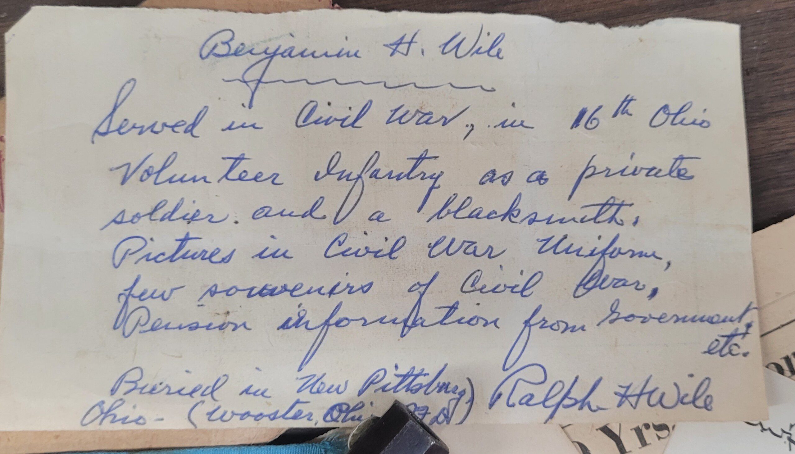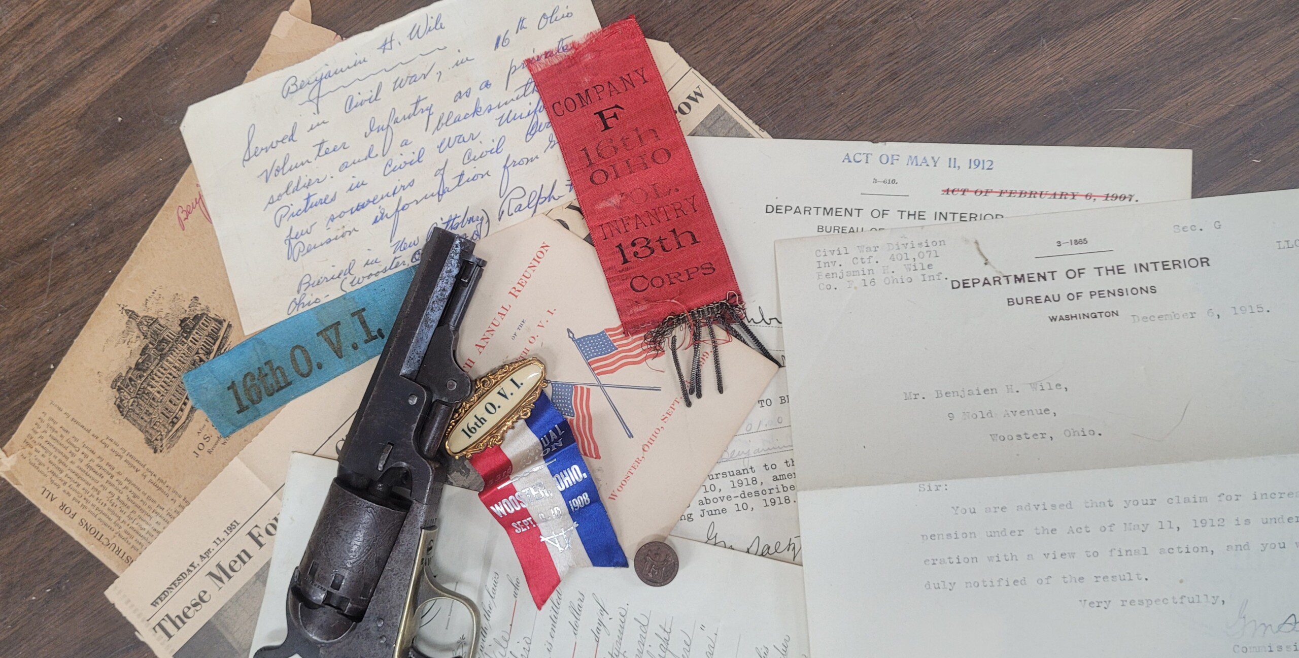 Fresh from an estate sale in Ohio, this fine weapon has a family history of being carried by an Ohio soldier, Benjamin H. Wile, who served in the 16th Ohio Volunteer Infantry 1862-1864. Numerous original documents accompany the pistol including Civil War reunion ribbons, a GAR (Grand Army of the Republic) lapel pin, pension papers and a newspaper clipping.