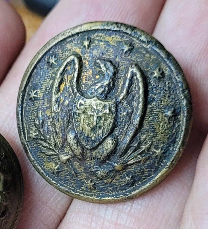 While most known examples of this massive and beautiful button are non-dug (typical retail $1,250), this one has a verbal history of being found in a camp near the battlefield of Wyse Forks, commonly called the “other” Battle of Kinston, NC !