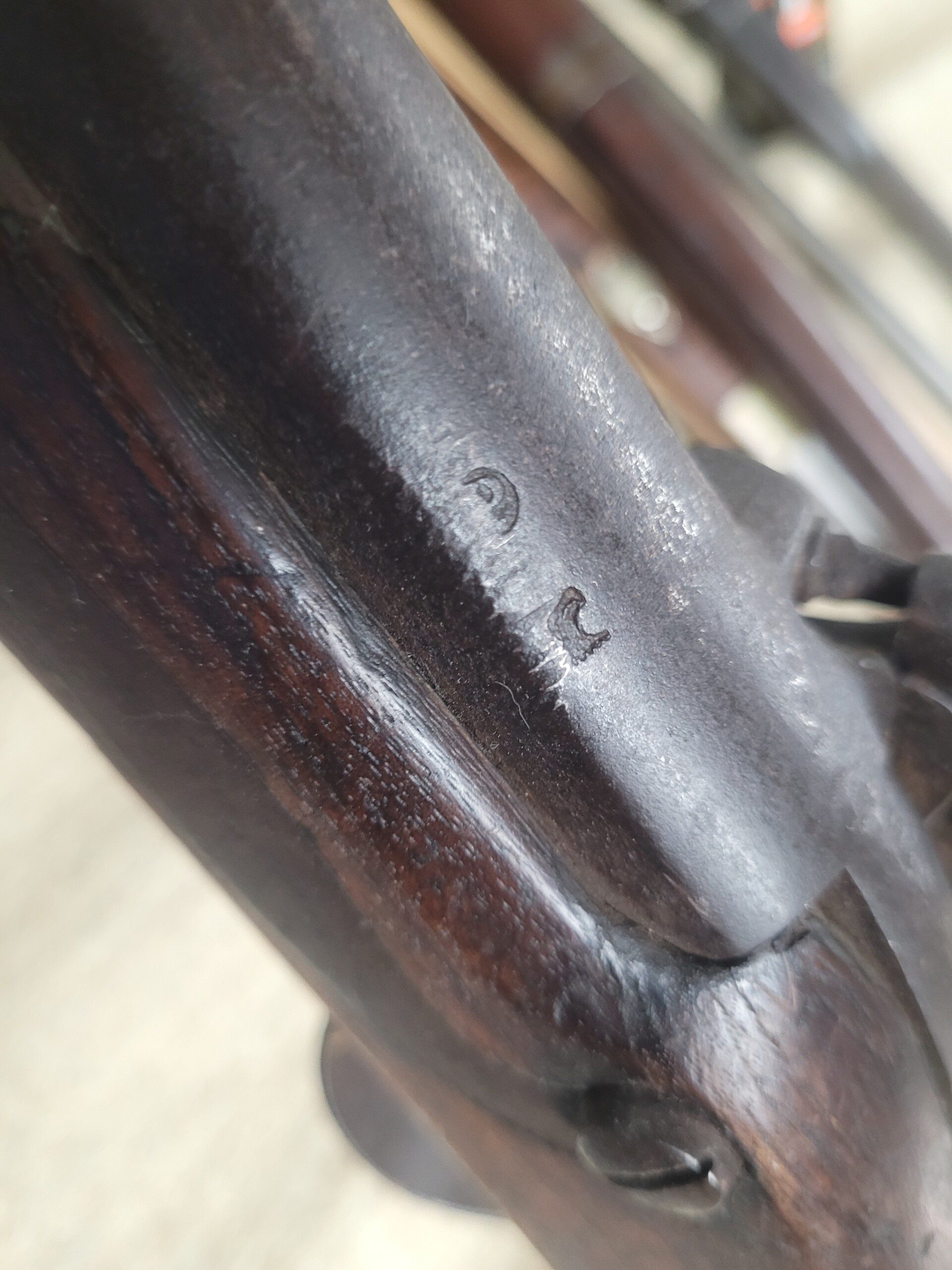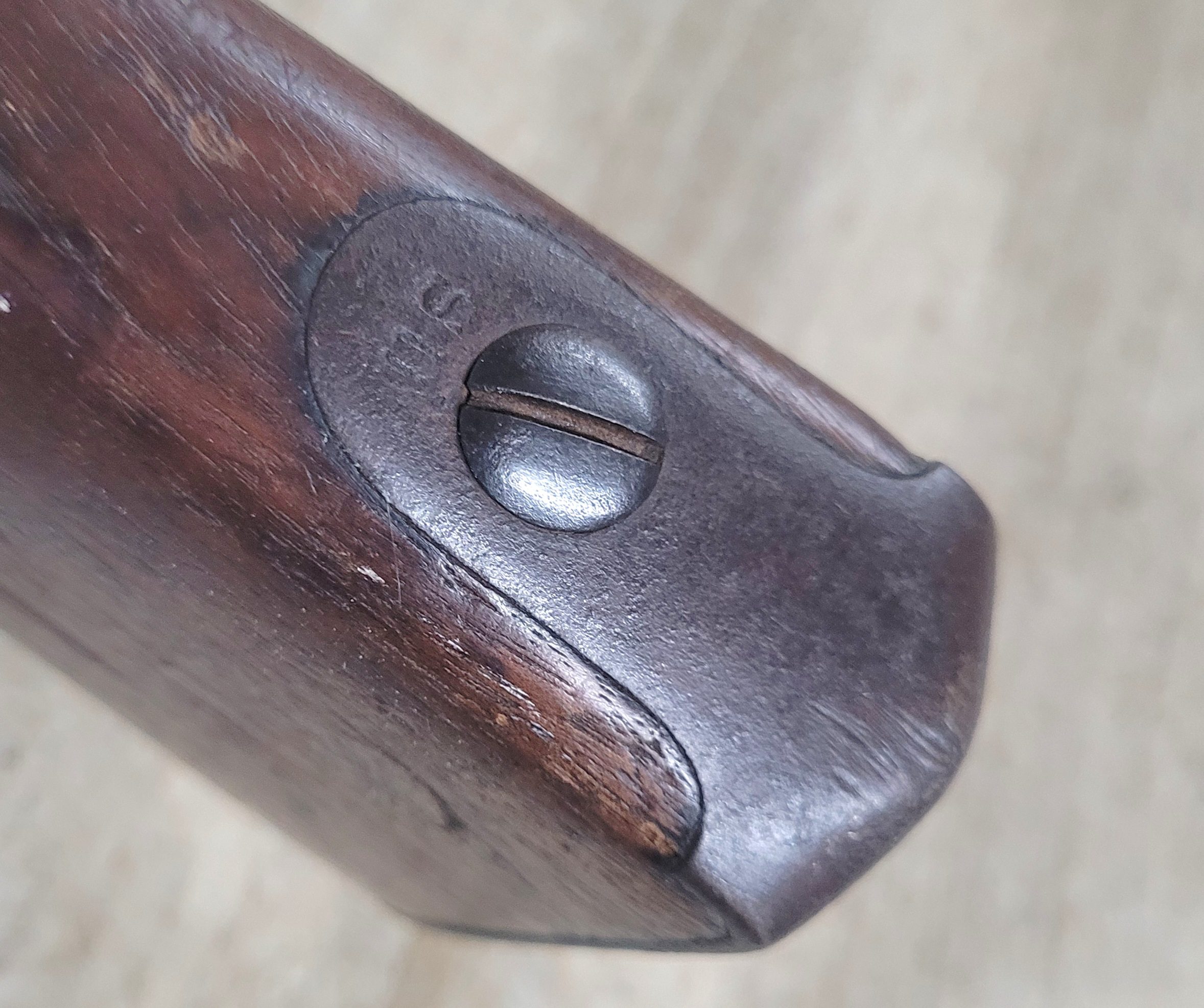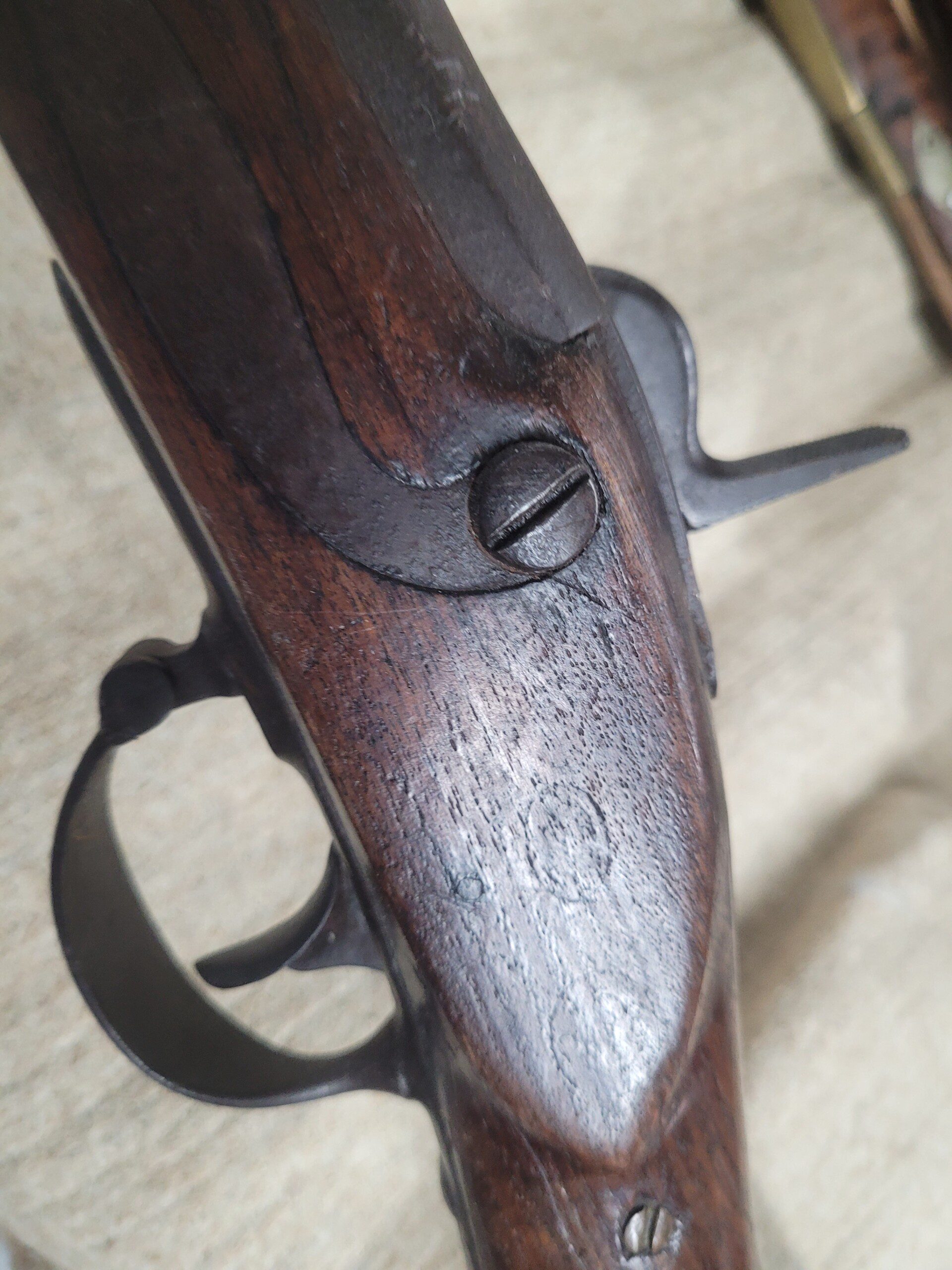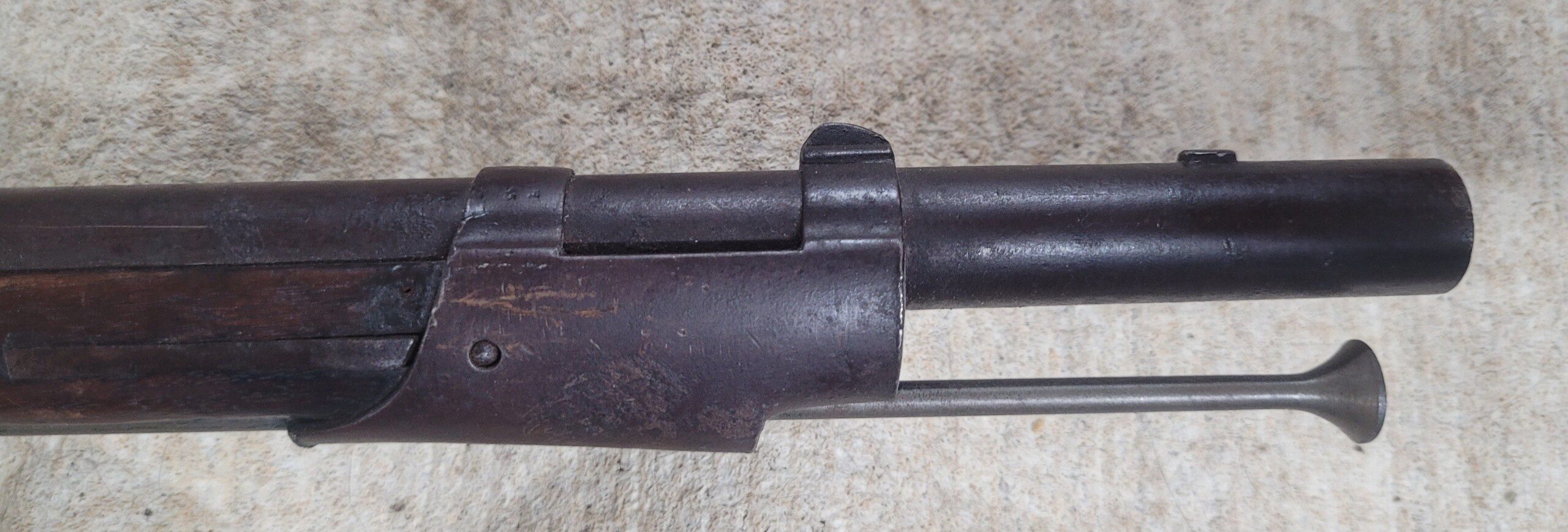 The lockplate has the four-line maker’s mark “REMINGTON’S / ILION N.Y. / 1857 / U.S.” behind the hammer. All hammer/trigger mechanics are strong. The internal Maynard parts are all complete and operational. The musket has a one-piece stock of dark walnut. The stock has great depth of color and original finish and the wood remains in very good condition. There is some minor chipping below the lockplate and the long range rear sight is no longer present. There are two nicely stamped cartouches visible on the left side flat.